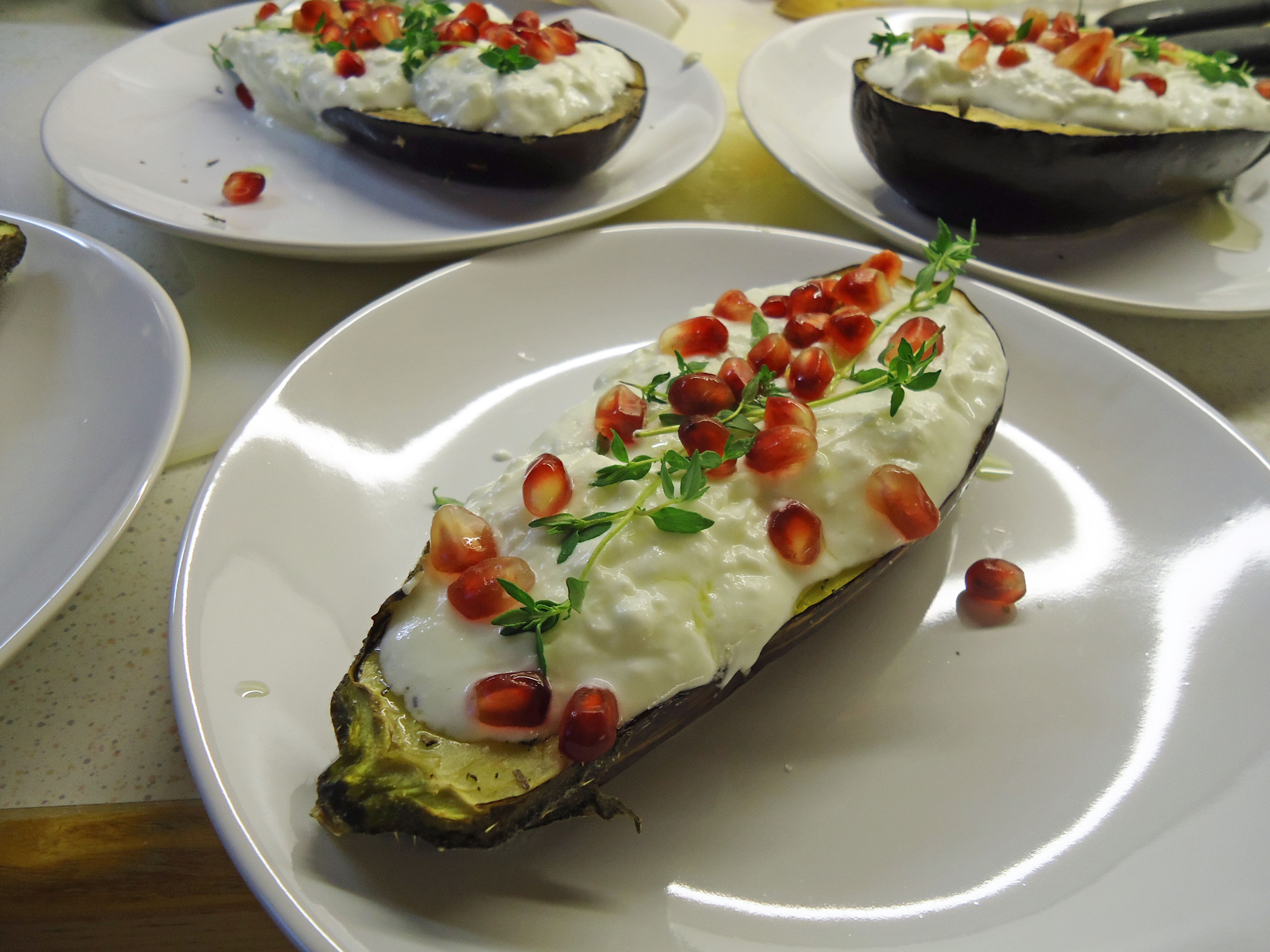 Melanzani (im Ofen, Thymian, Olivenöl) mit cremigmildem Schafskäse (Knoblauch, Olivenöl), Garnierung: Himalayasalz, frische Thymianzweige & Grantapfelkerne (Rezept)
