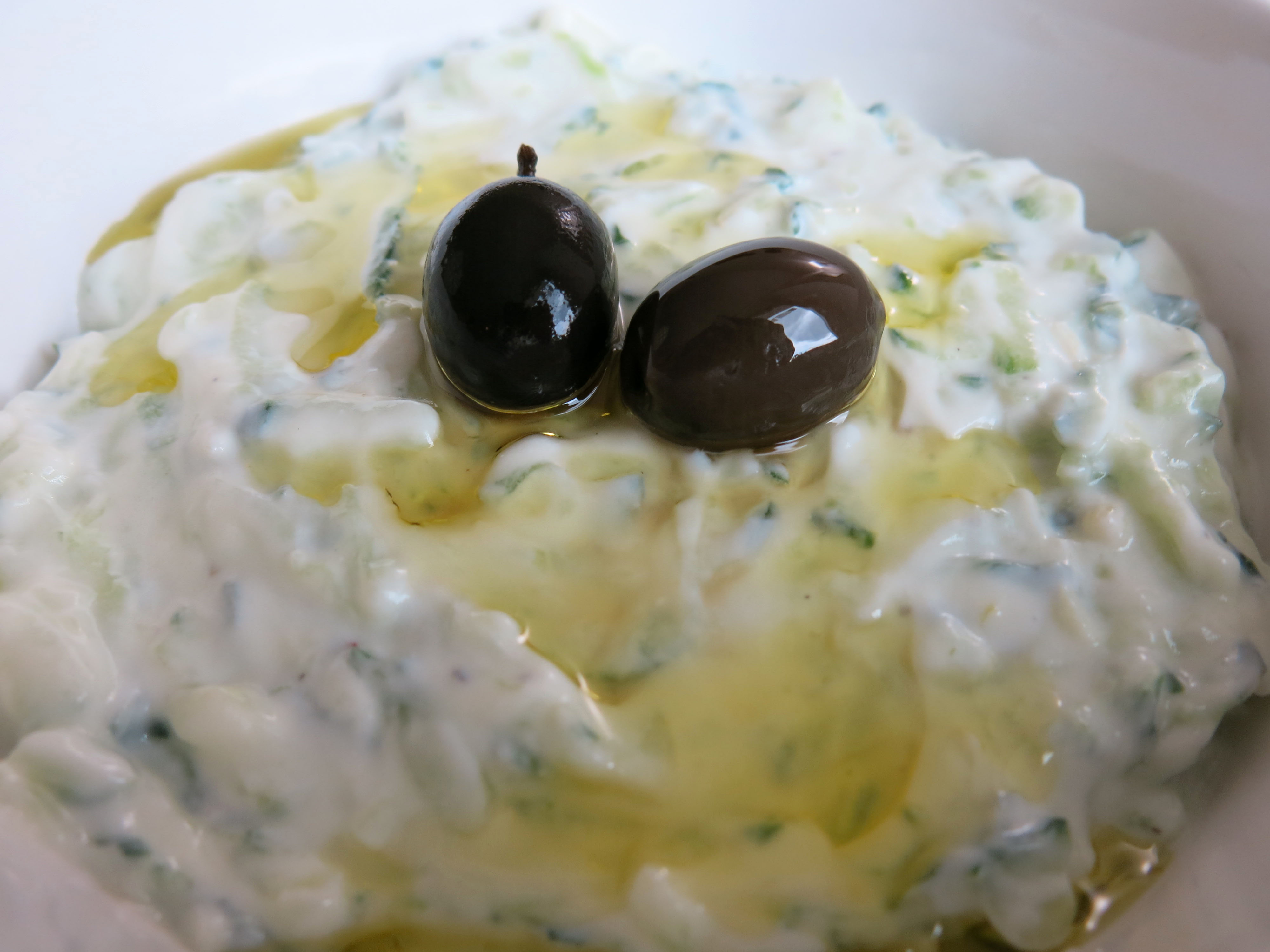 Die abgetropfte Gurke mit dem Joghurt mischen, mit etwas Olivenöl beträufeln und mit Oliven servieren.
