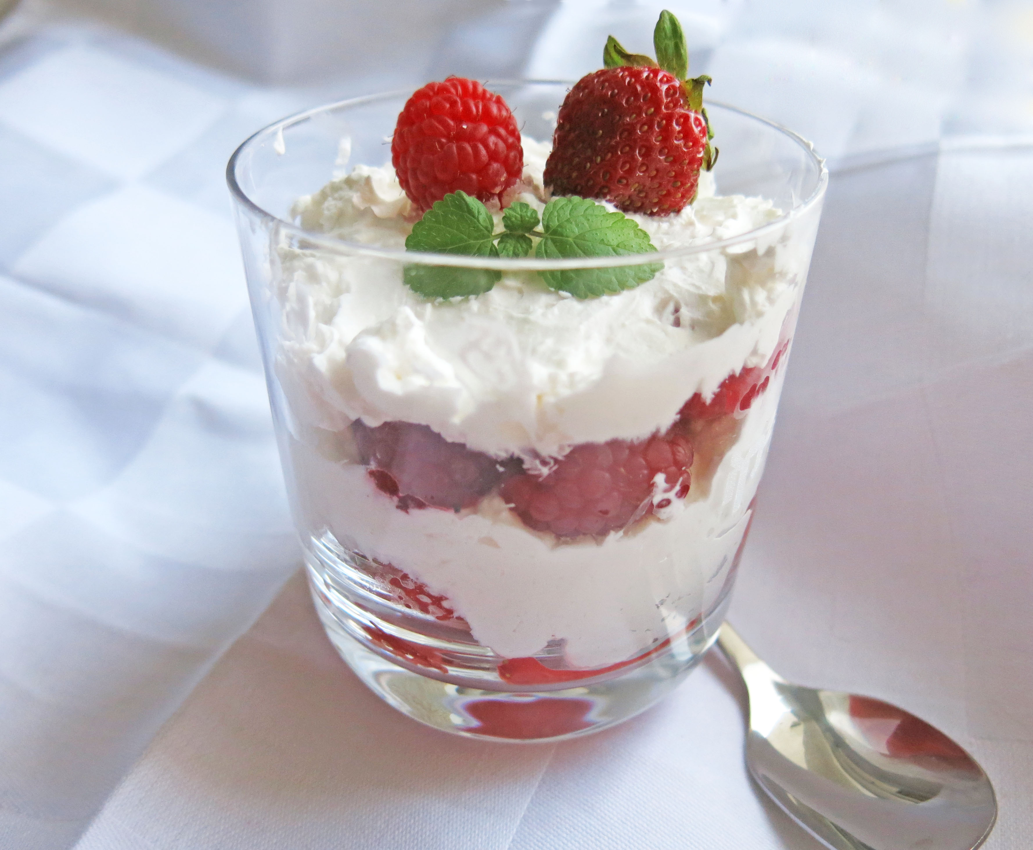 Mit einer Erdbeere, einer Himbeere und einem Blatt Zitronenmelisse oder Minze dekorieren.