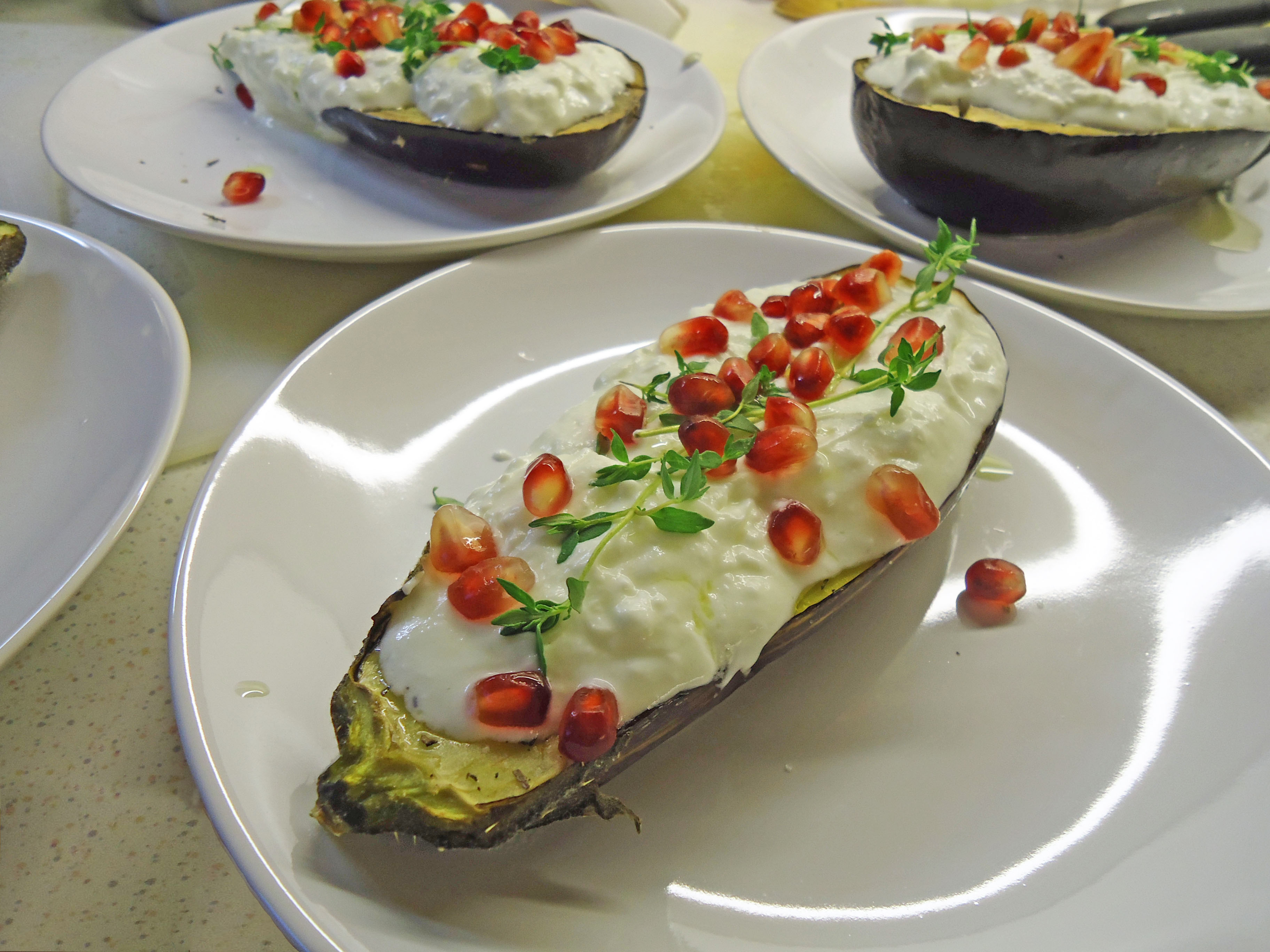 Melanzani (Aubergine) mit Thymian und Olivenöl einreiben, im Ofen garen.