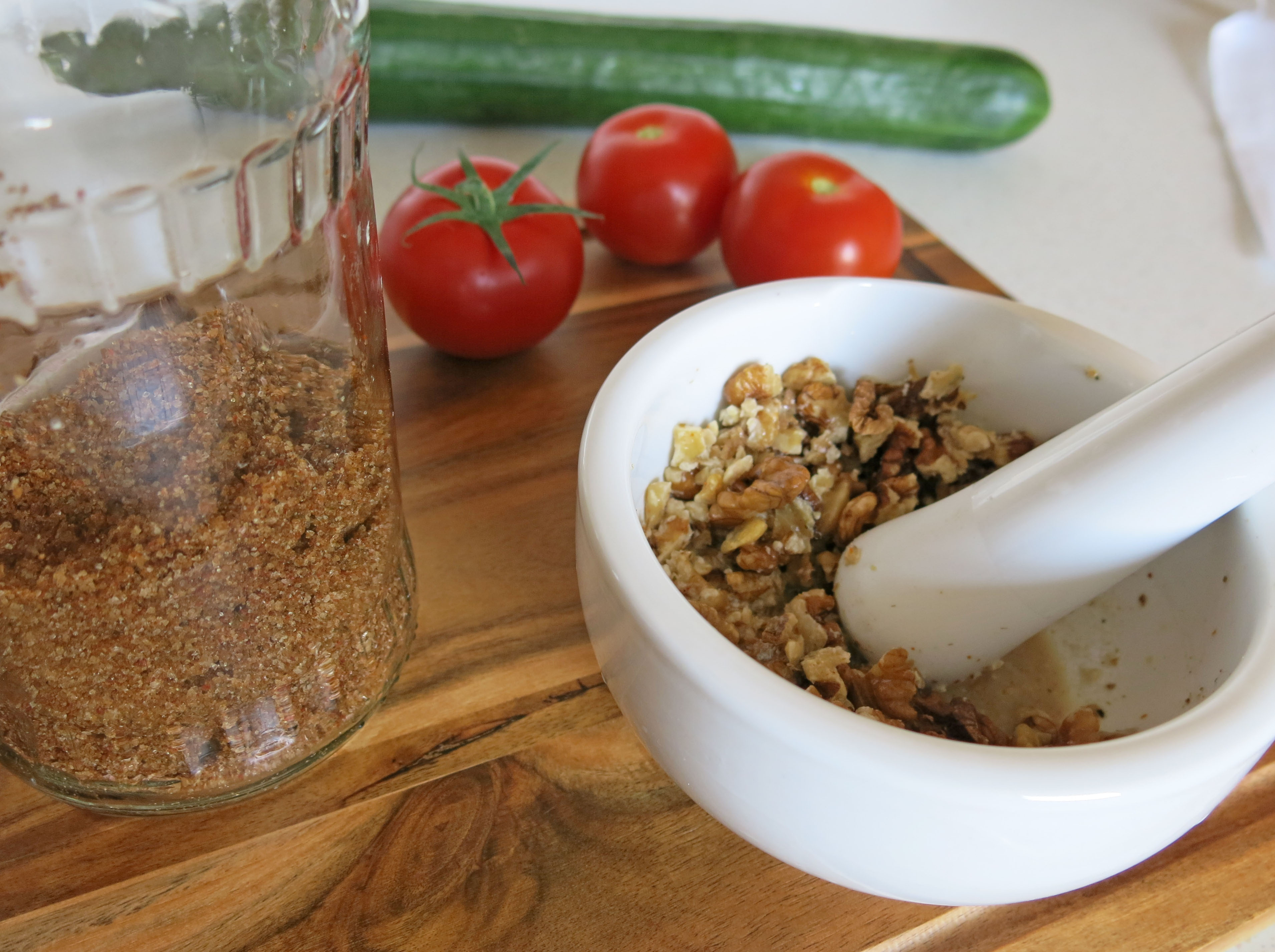 Rezept für Tomate-Gurke-Salat mit Walnusspaste (für zwei Personen):