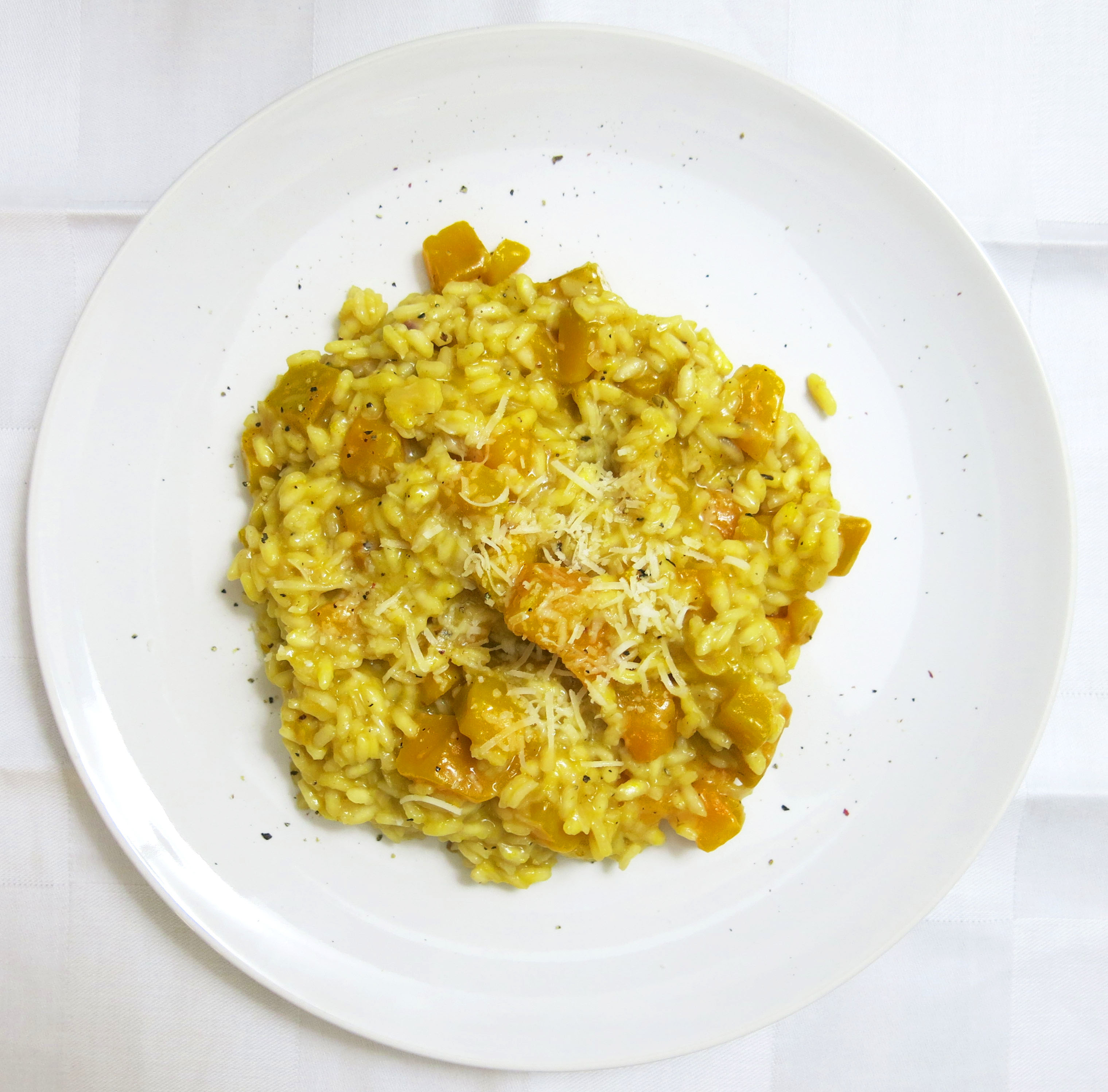 aufgießen und 6 Minuten unter gelegentlichem Rühren sanft köcheln lassen. Dann den Kürbis dazugeben und weitere 6-9 Minuten köcheln lassen. Der Reis soll noch bissfest sein, die Flüssigkeit soll nicht ganz verdunstet/aufgesogen sein. Eventuell Wasser/Wein/Suppe nachgießen.