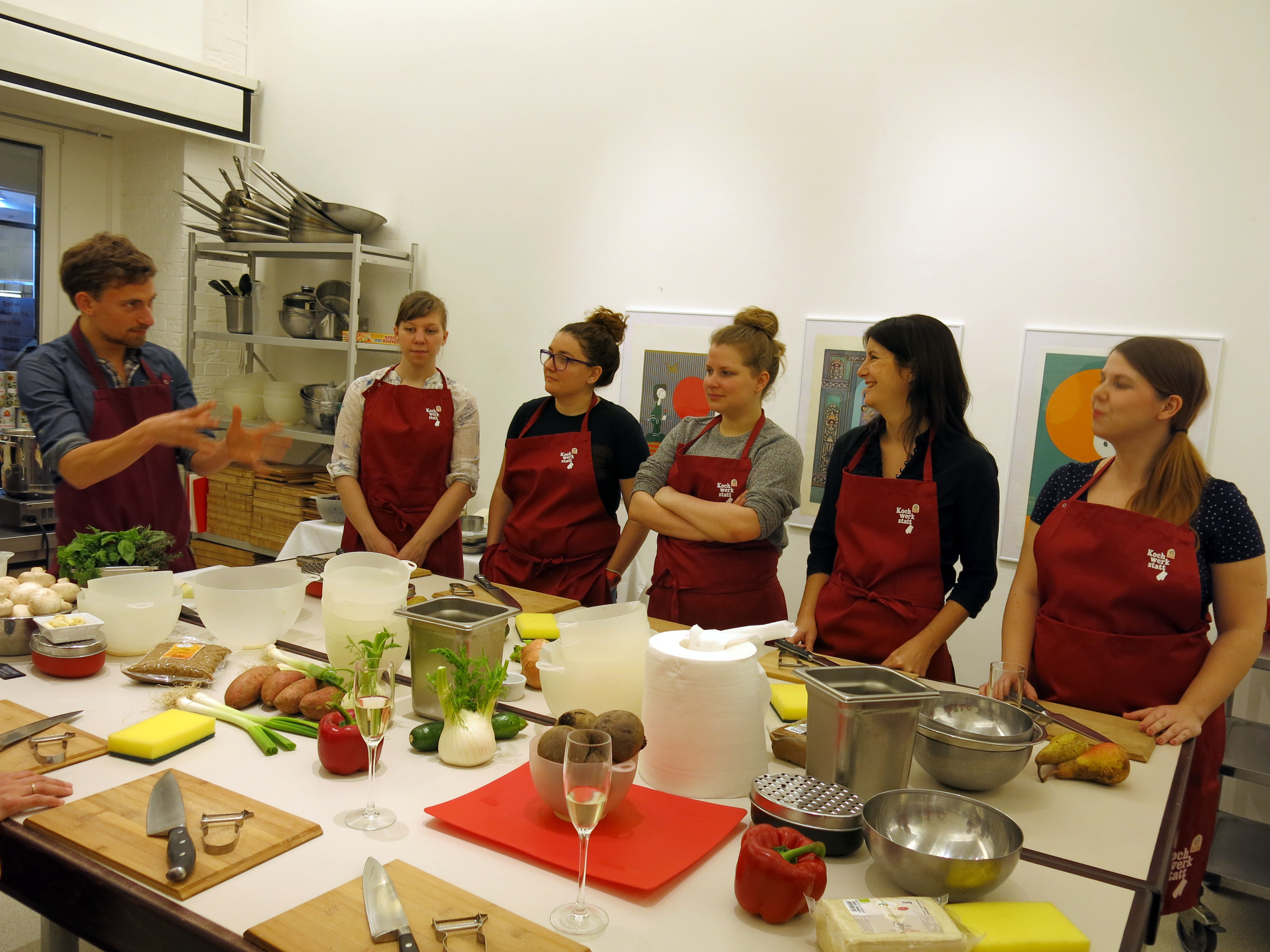 Der Chefkoch des Wrenkh Karl Wrenkh wirbelte durch die Küche und knauserte nicht mit Rezepten und Küchentipps. So weiß ich nun, dass man Holzbretter zuhause am besten nicht mit Wasser wäscht, sondern ölt und trocknet, zu Pilzen am besten Thymian oder Bohnenkraut passt und man zu Süßkartoffeln etwas Apfelessig geben soll.