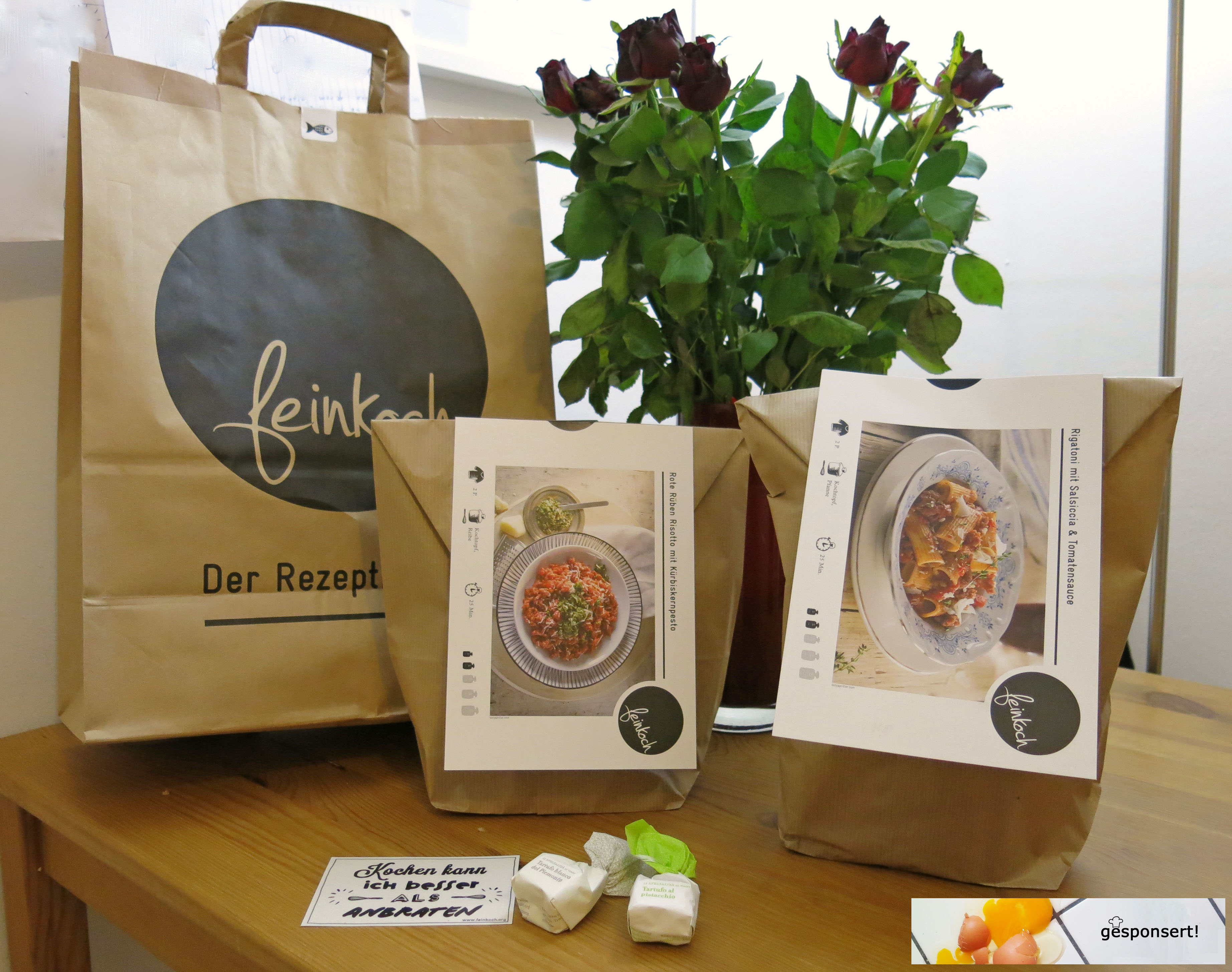 Vorportioniert ist schon mal alles, frische Kräuter gibt’s auch. Allerdings musste ich richtig lachen bei dem winzigen Stückchen Parmesan. Zum Glück hatte ich noch frischen Parmegano zuhause.