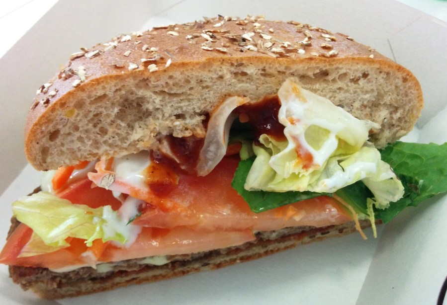 Burger 1: Erebos (Vollkornbrot, Karotte, Kebab- und Salsa-Sauce, Rindfleisch, Bacon, Käse…) 3x abgebissen