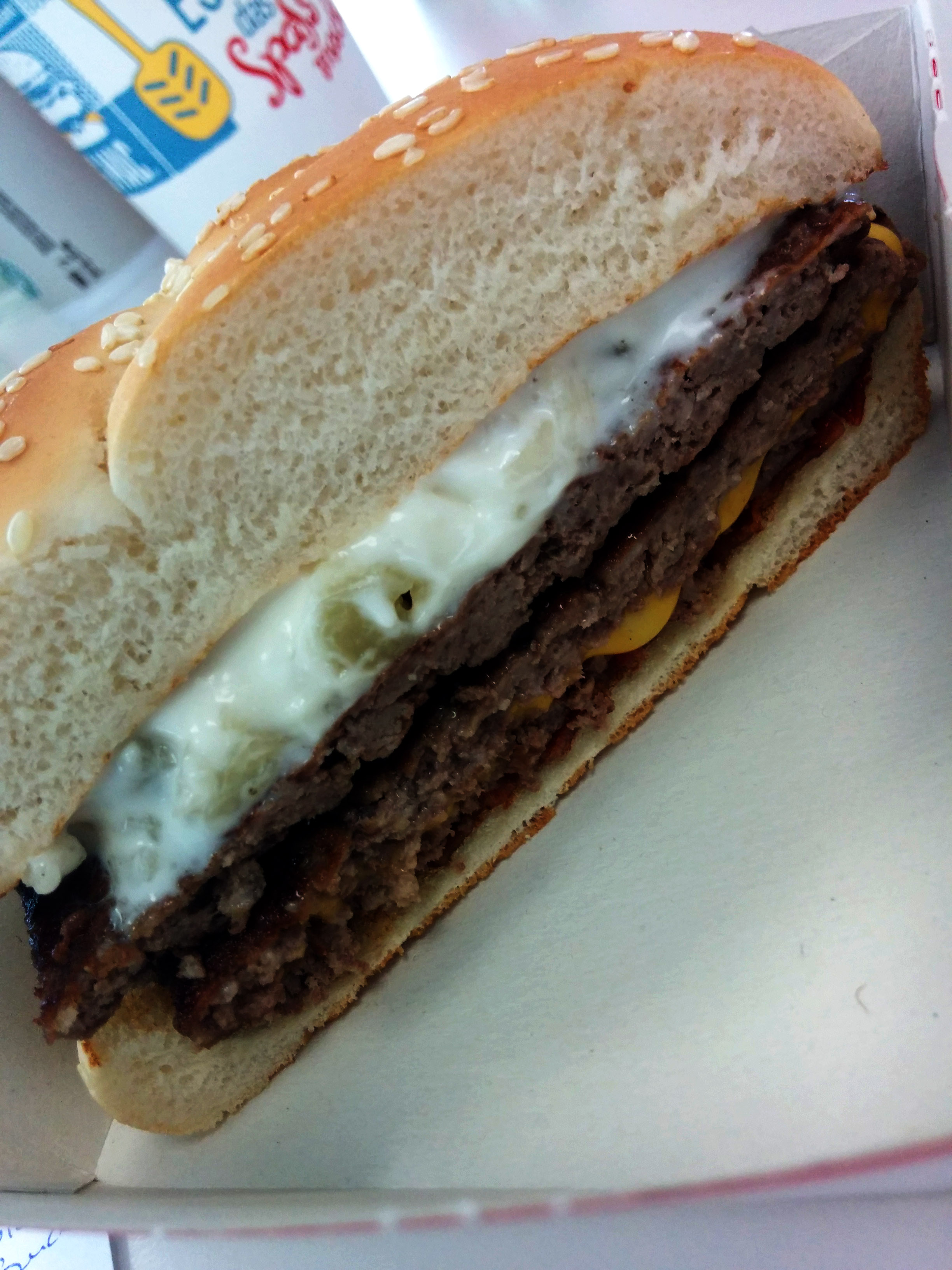 Burger 10_ Hawaii Burger (Ananas, 3x Rindfleisch, Speck, Kebab- und Sandwichsauce…) 2x abgebissen