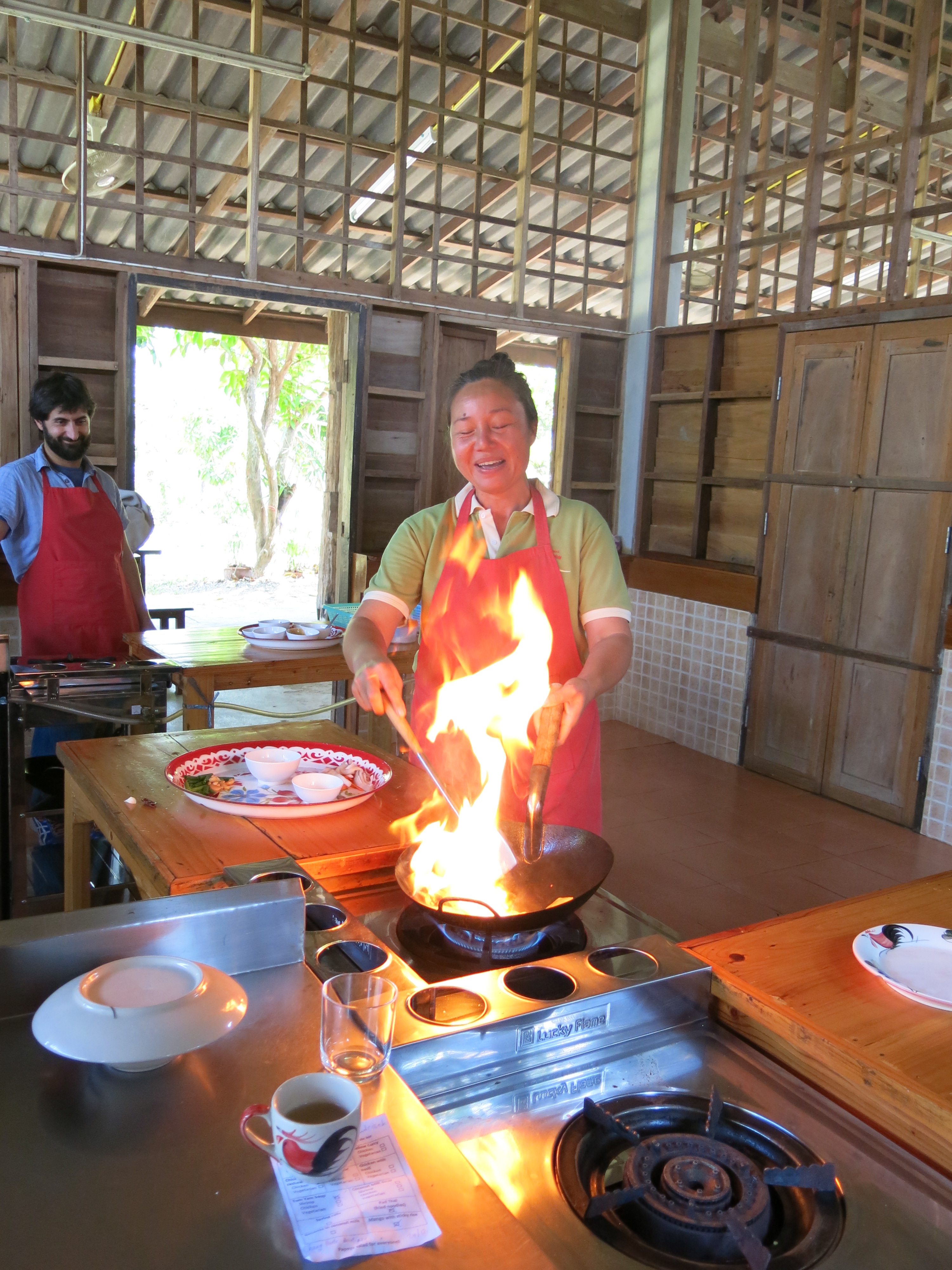 Danach sind wir in die Kochschule etwas außerhalb von Chiang Mai gefahren und haben uns auf der Farm die Gewürze und Gemüse im Garten erklären lassen und verkostet. Während dessen hat Trainerin mit ihrer bubbly Personality hat die Gruppe von zehn Touristen erheitert und bei Laune gehalten – am meisten hat sie selbst über ihre eigenen Witze gelacht!